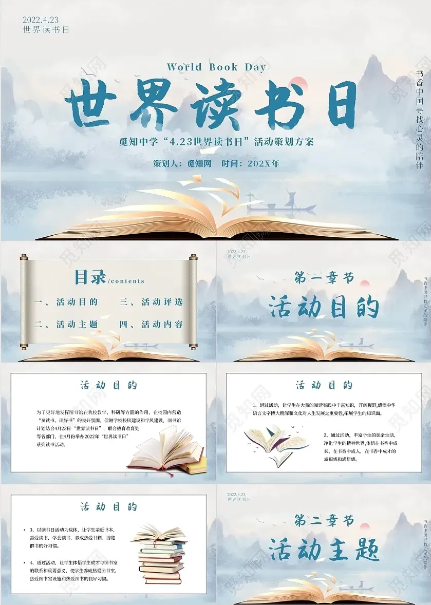 简约水墨水彩世界读书日觅知中学世界读书日活动策划主题PPT