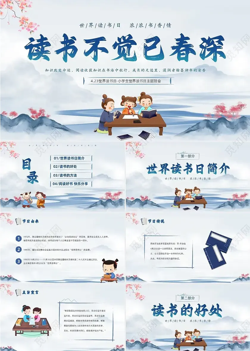 淡雅中国风卡通儿童4月23日世界读书日主题班会PPT