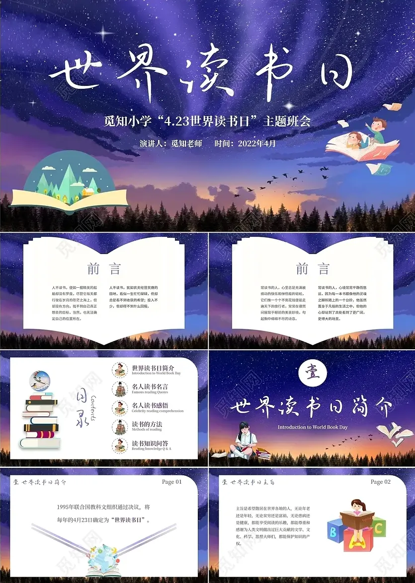唯美星空卡通阅读风世界读书日主题班会教师教学课件模板