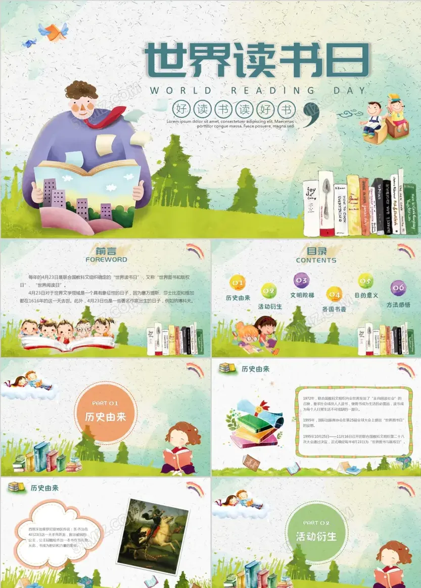 绿色卡通风小学生世界读书日班会PPT模板读书分享儿童读书会
