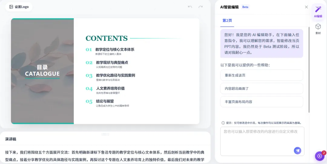 生成完之后,你可以继续编辑。文字直接点进去改,图片位置随手拖,整体风格觉得不对还能重新换模板。整个编辑过程非常丝滑,没有那种传统PPT软件里"动一个元素全乱掉"的崩溃感。