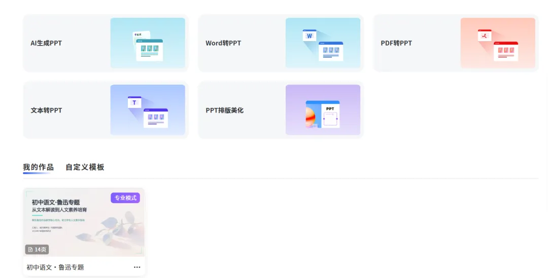 打开课件帮,直接输入你的主题,比如"初中语文·鲁迅专题",或者把你已经整理好的Word文档、PDF直接上传进去。然后就没你什么事了。