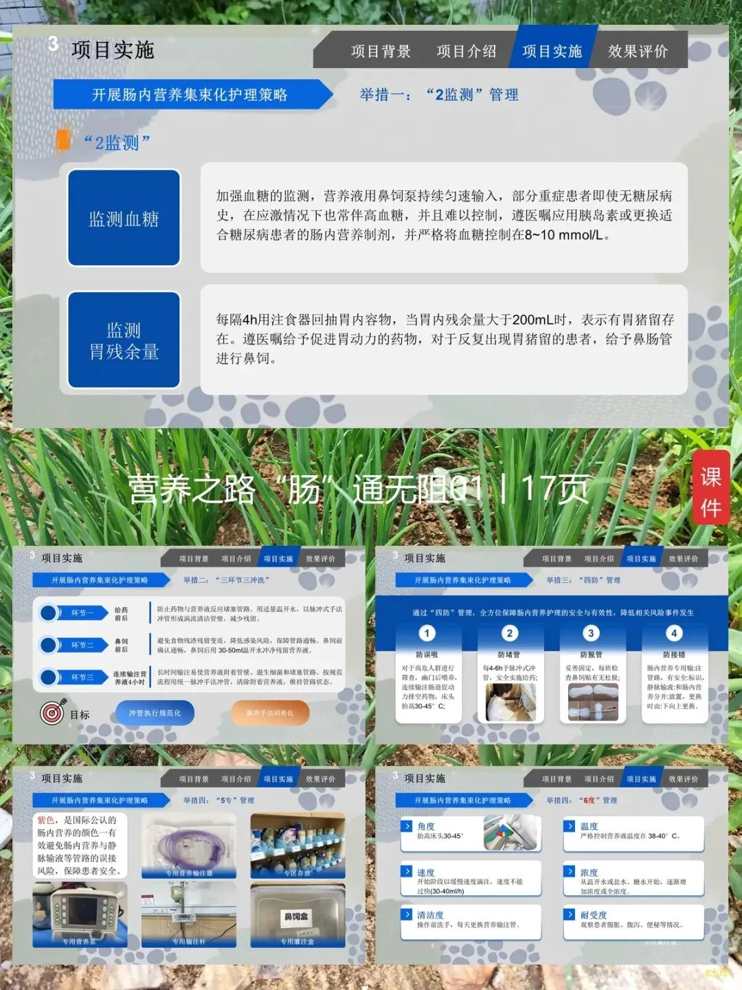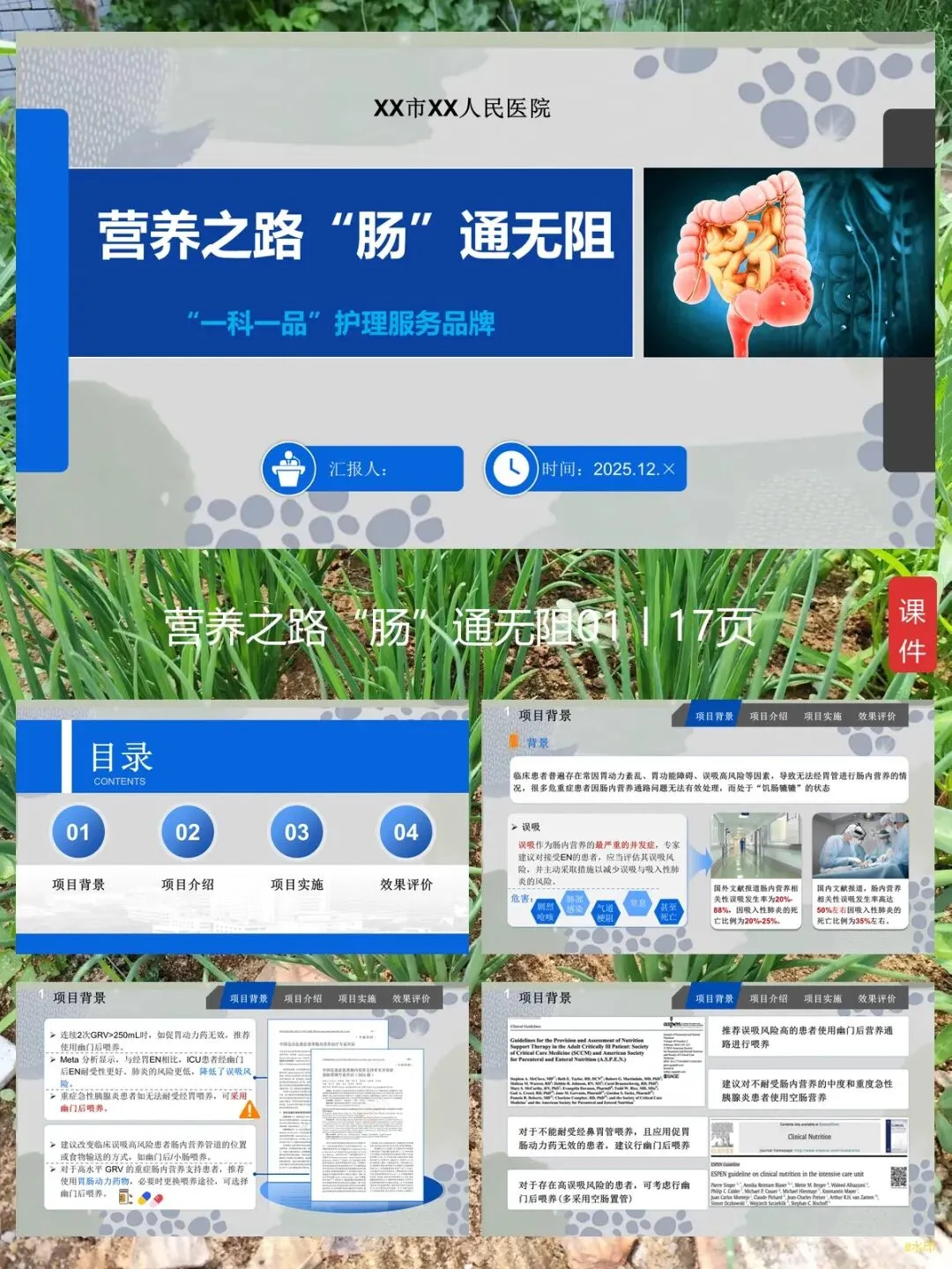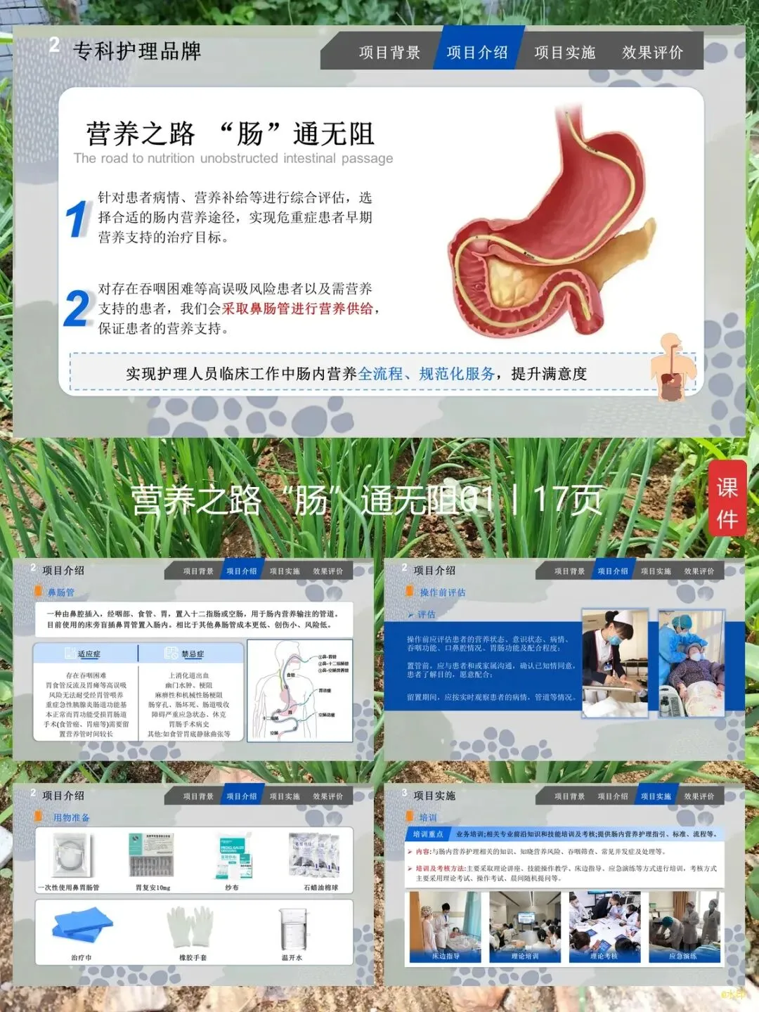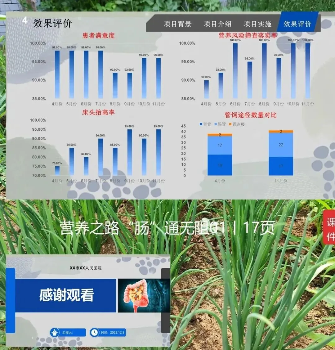 今天跟大家汇报一下我们科的 “一科一品” 护理服务项目,名字叫营养之路 “肠” 通无阻。