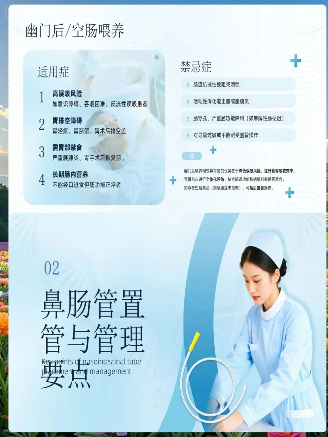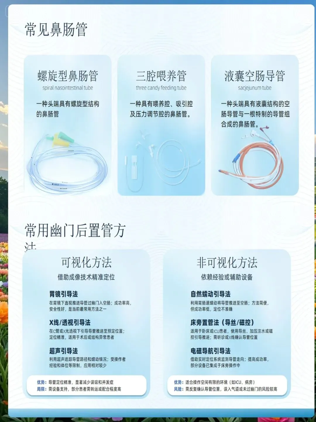 不是所有需要肠内营养的患者都适合鼻肠管,这里面有明确的适应症划分。临床上主要适用于:胃动力障碍或胃排空延迟的患者,比如重症胰腺炎、胃瘫综合征的病人;存在高误吸风险的患者,像是有反流误吸史、意识障碍合并吞咽困难的;以及部分手术后需要早期肠内营养支持的患者,比如胃肠道手术后的早期进食阶段。