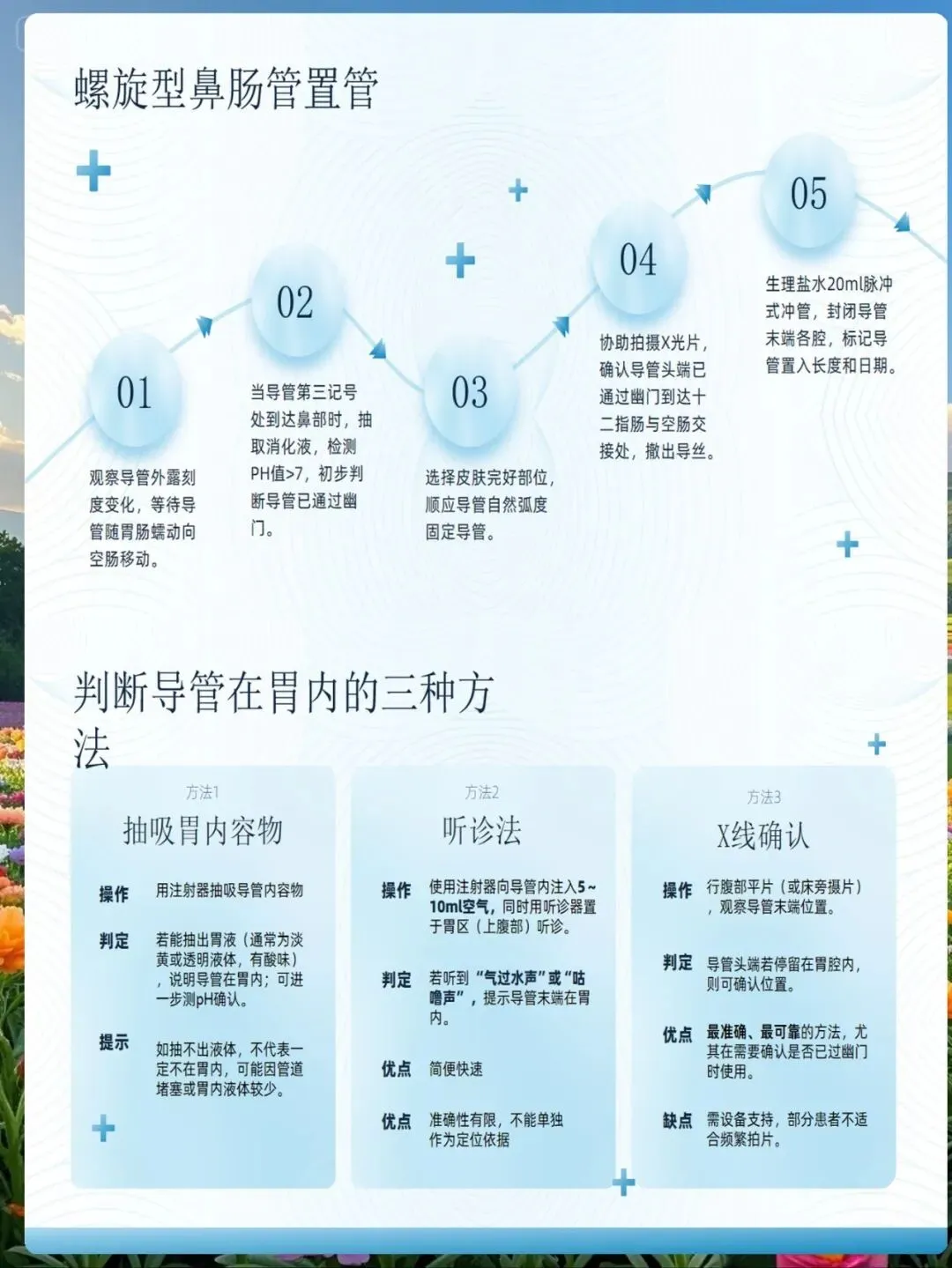 管子到位后必须确认位置,这是最容易被忽视的环节。pH值检测是最常用的床旁方法,回抽液的pH值大于5.5通常提示管子可能在胃内,小于5则更支持空肠位置的判断。但pH值受很多因素影响,包括患者是否使用了抑酸药。最可靠的方法还是X线定位,这是金标准,必要时一定要拍片确认。