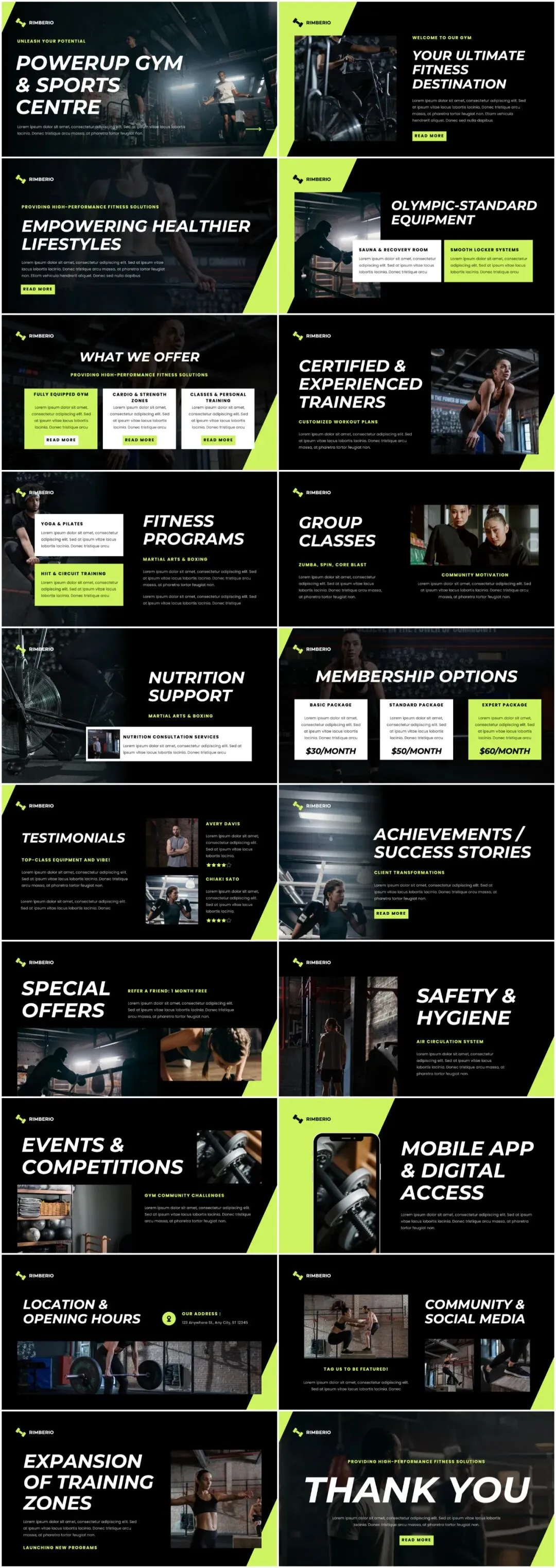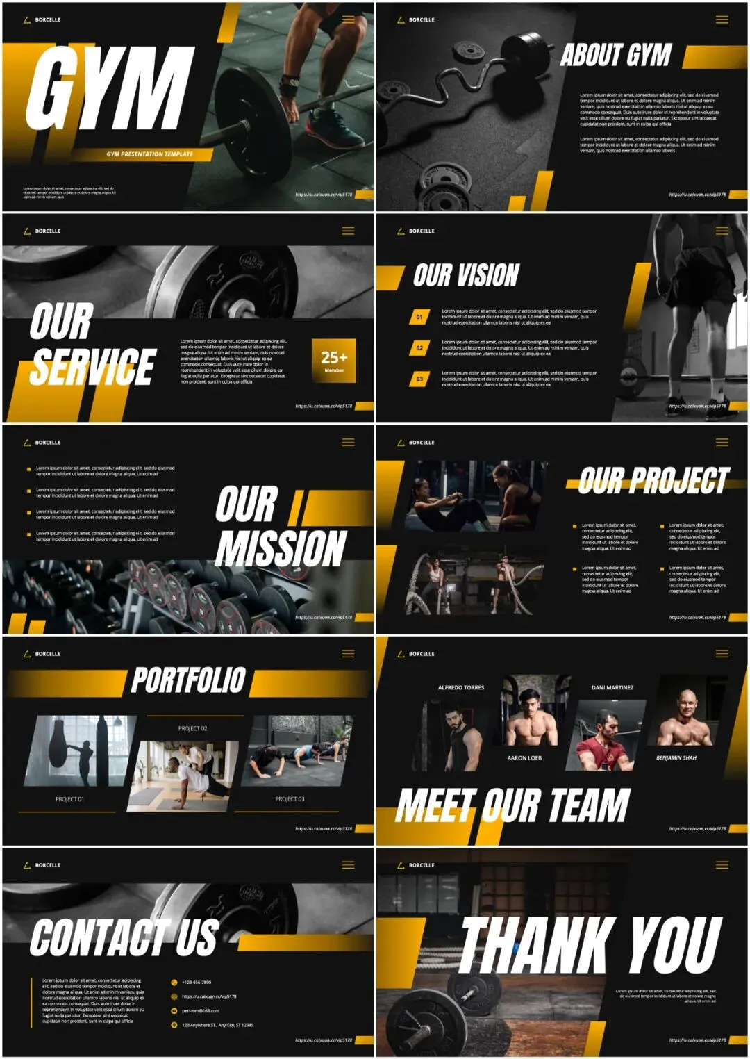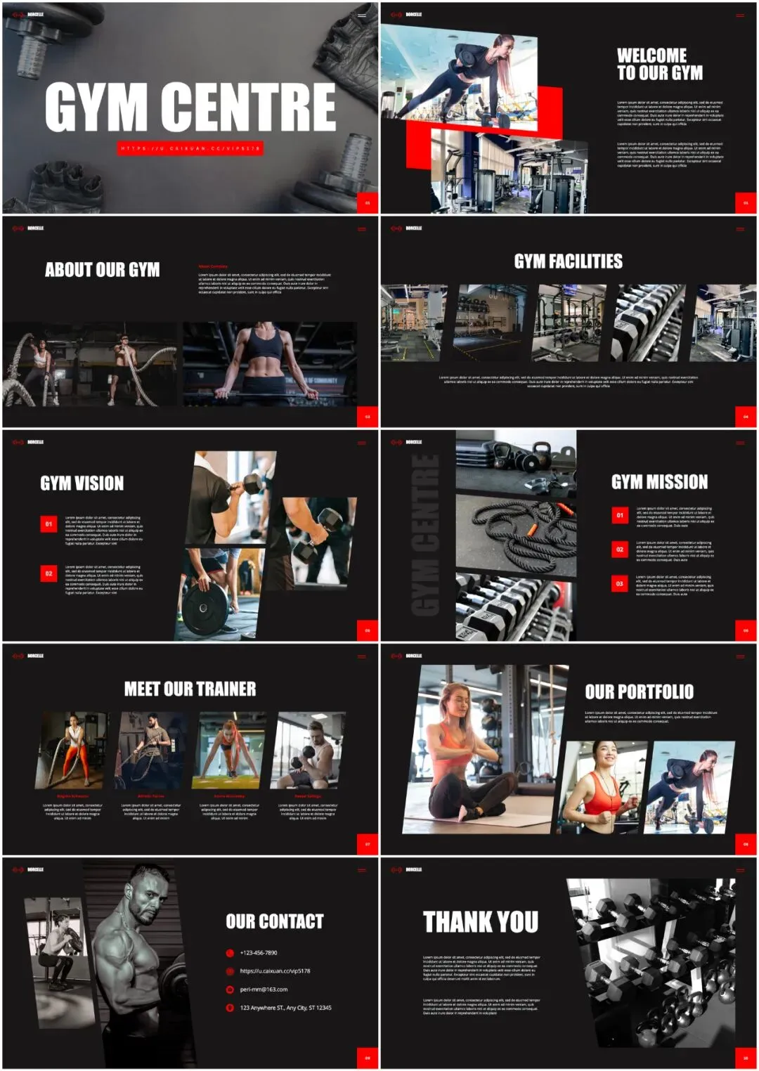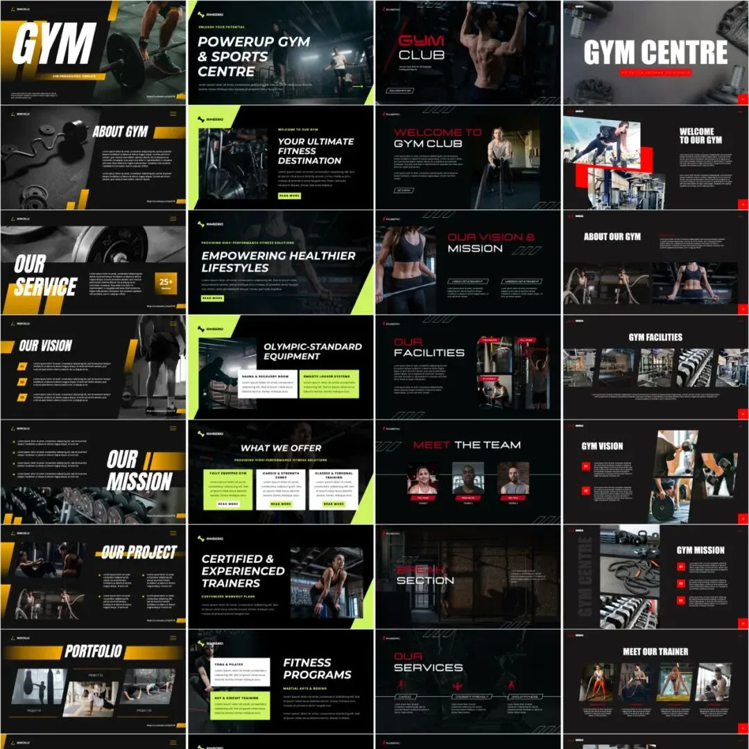 以黑色、黄色、深灰等充满力量感的色调为主,搭配健身场景、肌肉特写、健身器材的高清图片,每一页都像是从 “健身杂志封面” 中截取出来的。外行看了会觉得 “哇,好有力量感和活力”,内行则会赞叹 “配色和排版都很专业,很懂健身”,瞬间树立起 “专业且令人热血沸腾” 的形象。