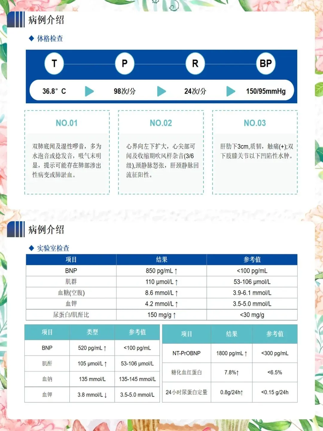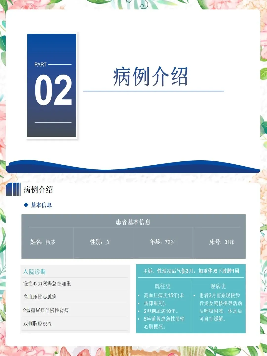患者杨奶奶,72岁,因“活动后气促3月,加重伴双下肢水肿1周”入院,诊断为慢性心力衰竭急性加重,合并高血压、糖尿病、胸腔积液等多种疾病。