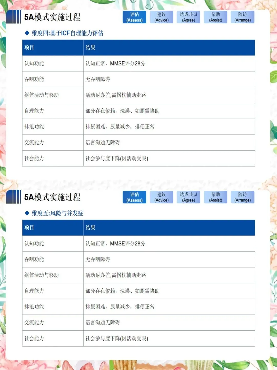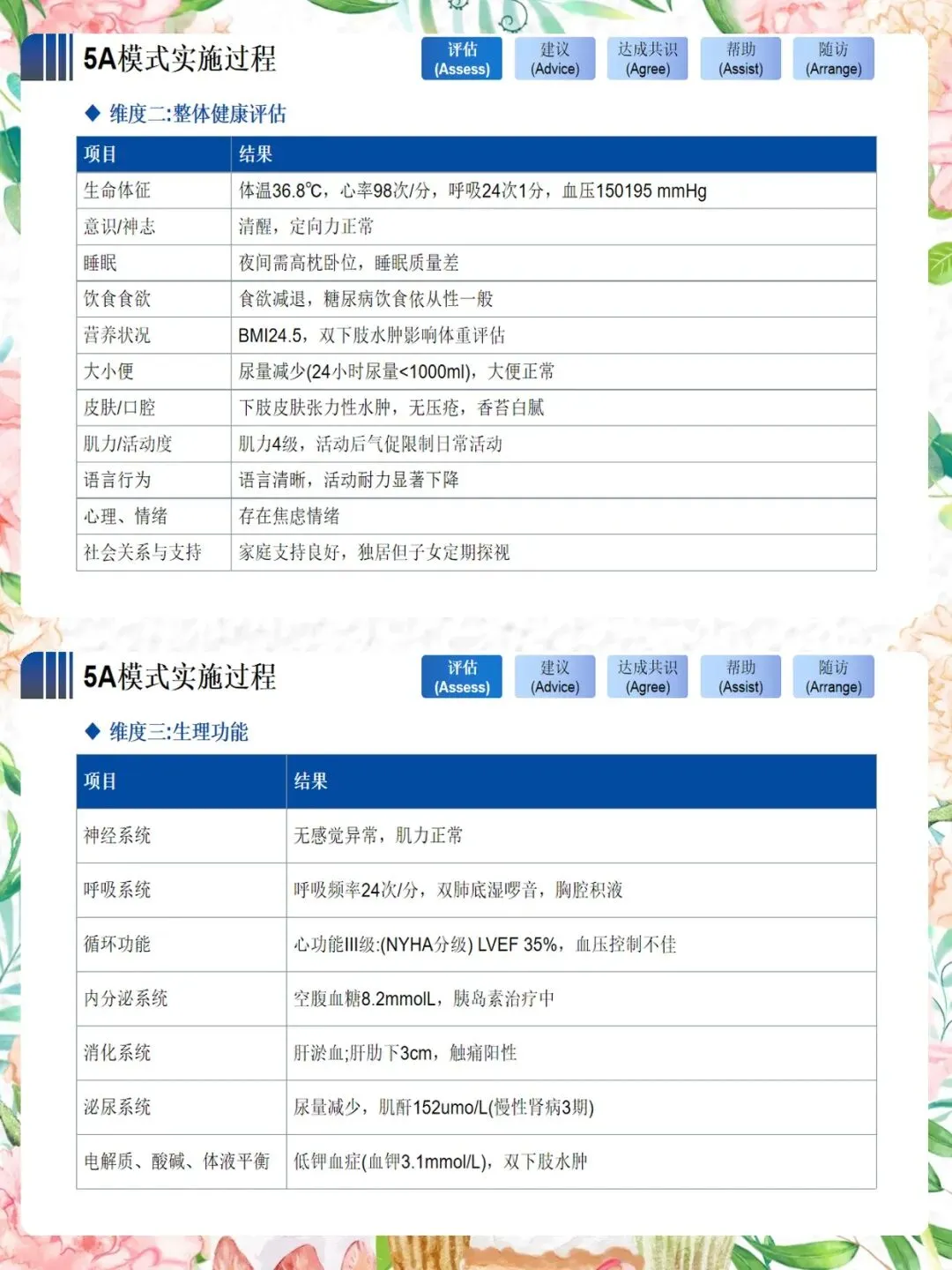 面对这样一位高龄、多病共存的患者,我们不是“头痛医头”,而是引入了5A护理模式:评估、建议、达成共识、帮助、随访。