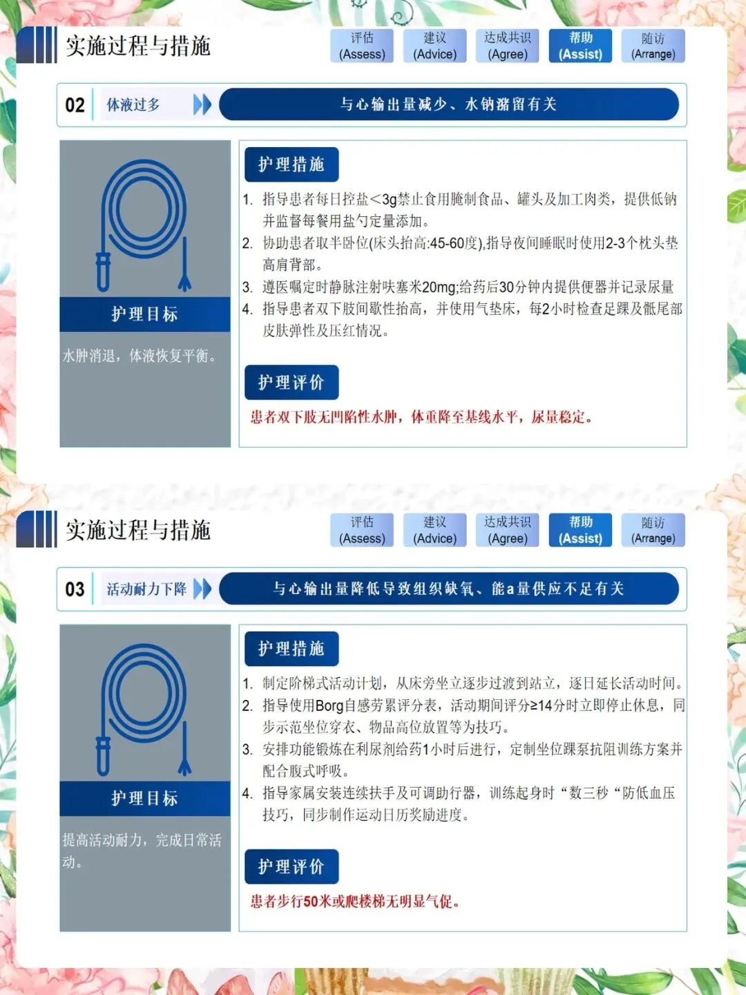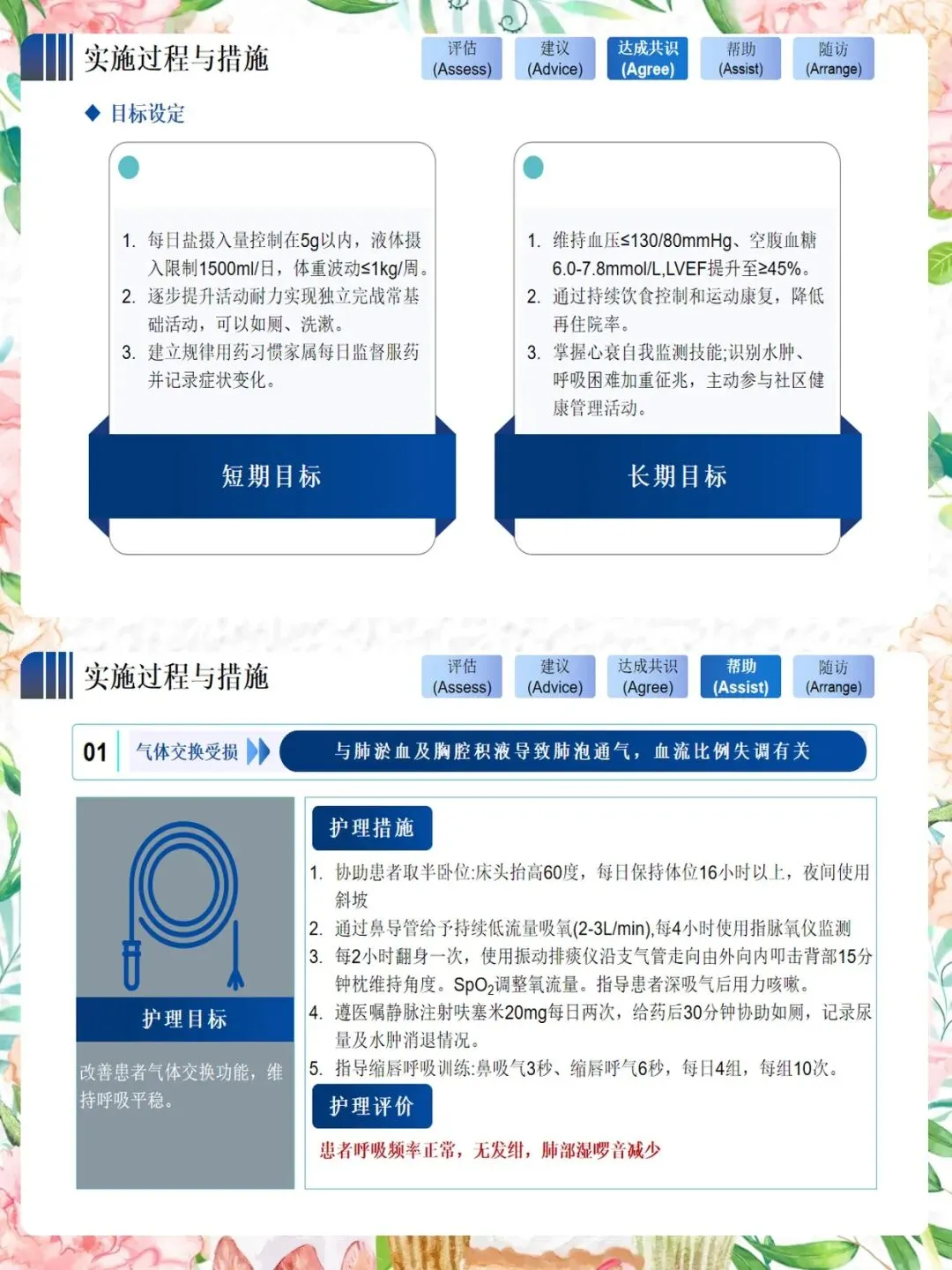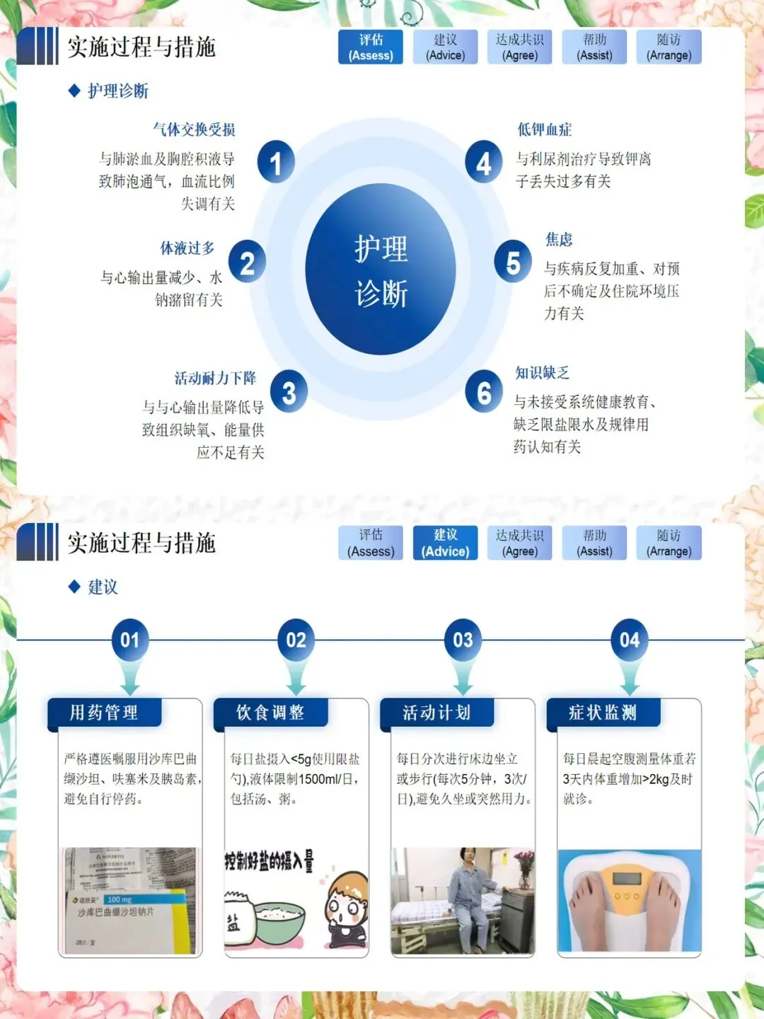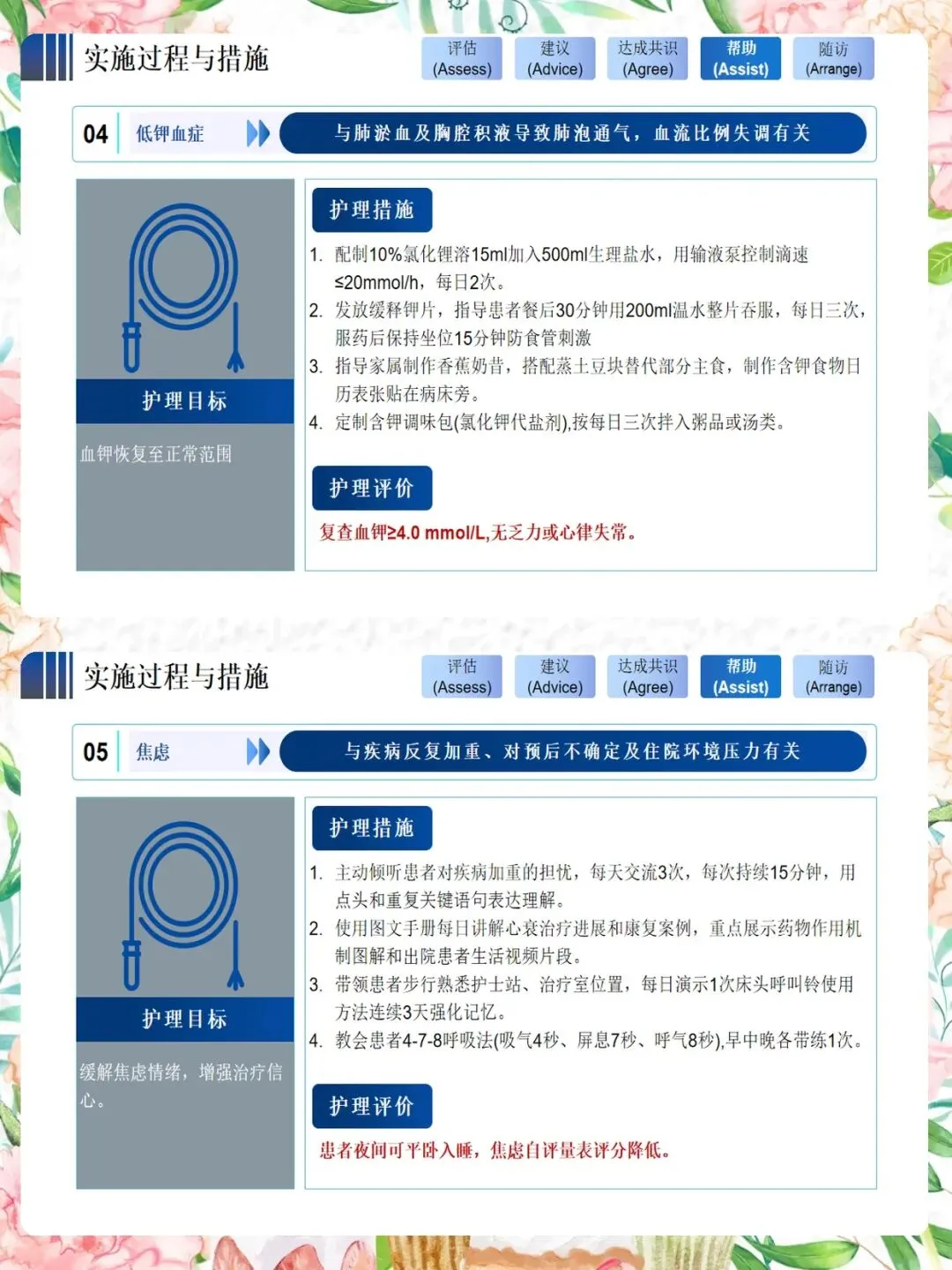 在评估阶段,我们从疾病、生理功能、自理能力、心理状态等多维度入手,识别出患者存在气体交换受损、体液过多、活动耐力下降、低钾血症、焦虑、知识缺乏等六大护理问题。