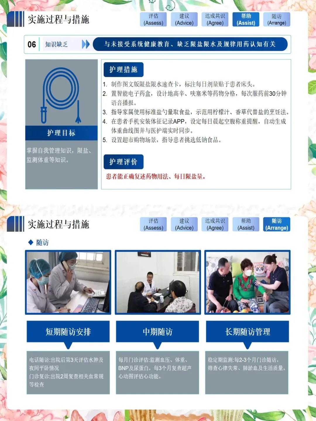 在帮助阶段,我们落实了具体护理措施:半卧位、低流量吸氧、缩唇呼吸训练、利尿剂管理、阶梯式活动计划、含钾饮食指导、心理疏导、智能药盒与体征记录APP等。