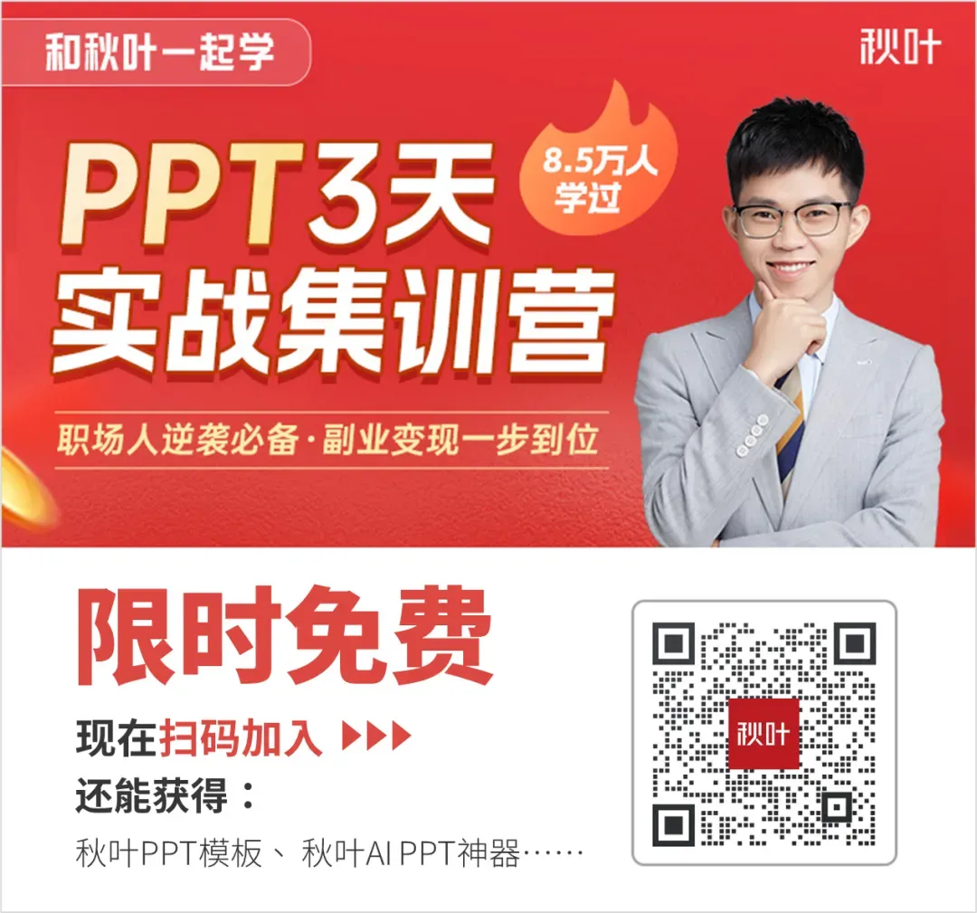 如果你还想要系统学习做PPT的技巧,跟着专业老师掌握从基础制作到副业接单的全流程,欢迎来参加我们的《秋叶PPT 3天实战集训营》👇