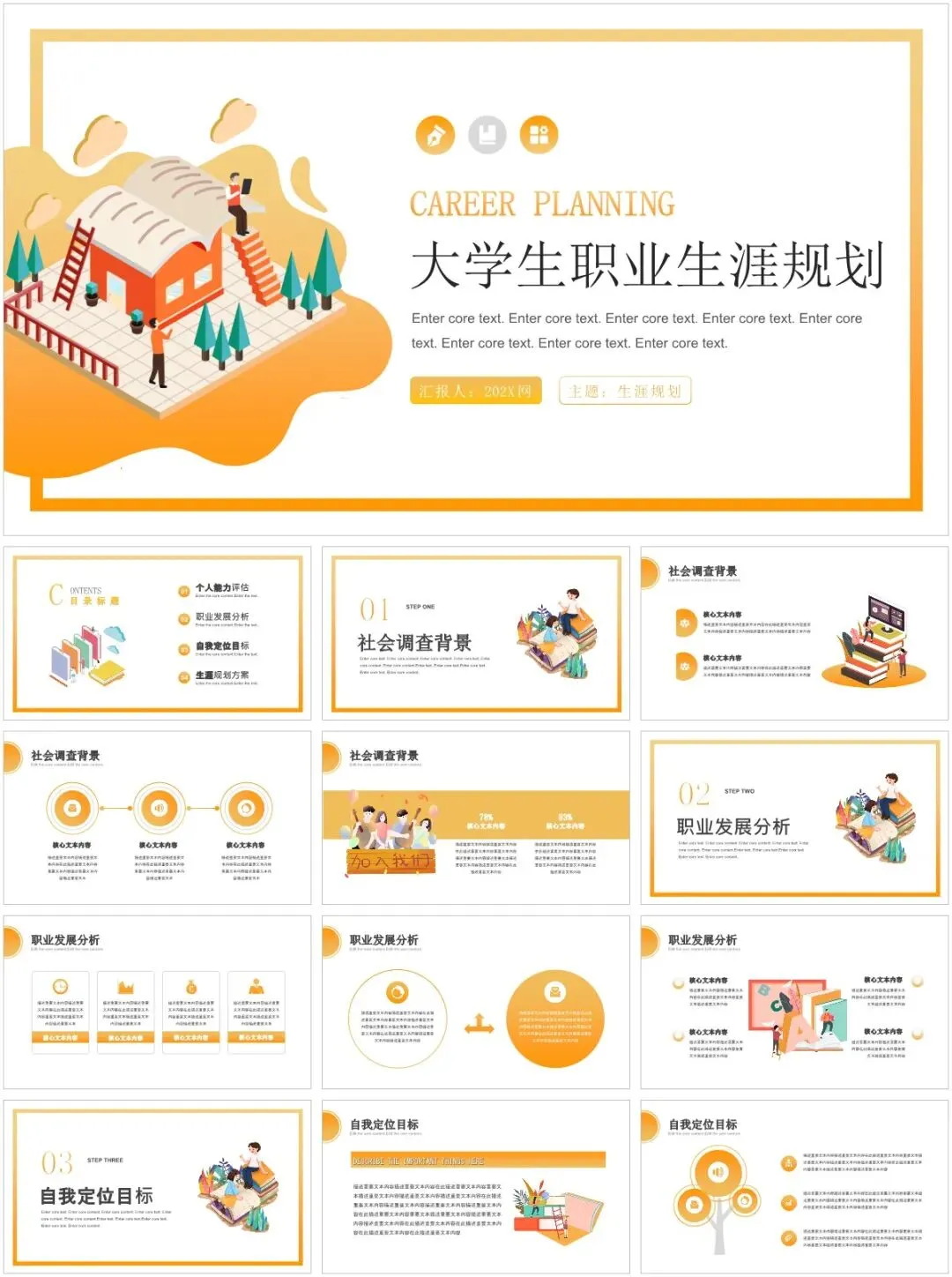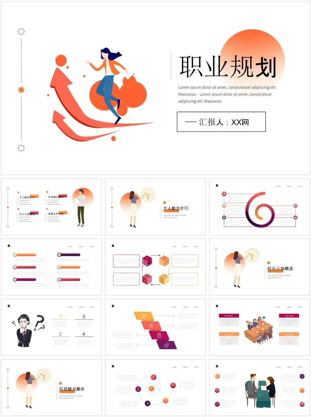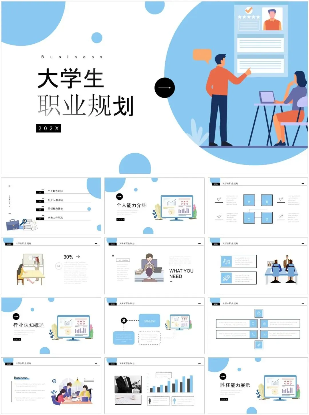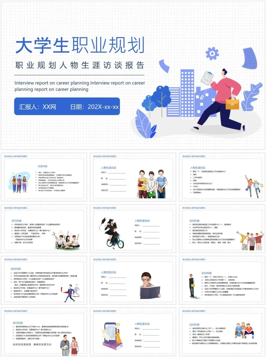 不管你是要做自我认知分析、职业目标定位,还是行业调研、访谈报告,通通都有对应的风格可选。商务简约风、清新学院风、访谈实录风……各种排版和配色都有,直接把内容替换进去,几分钟就能搞定一份专业又好看的职业规划PPT,再也不用对着空白页干瞪眼了!