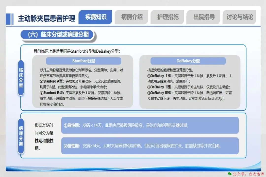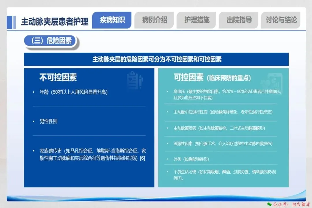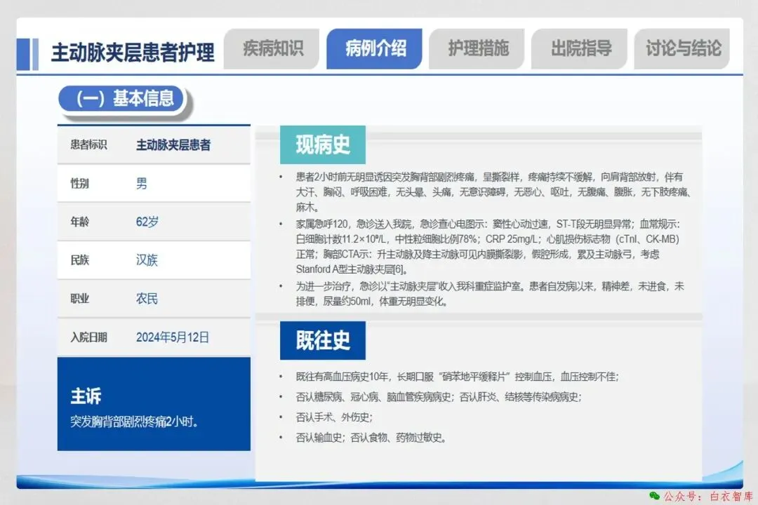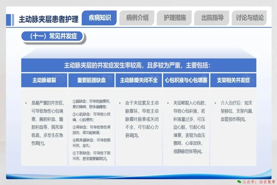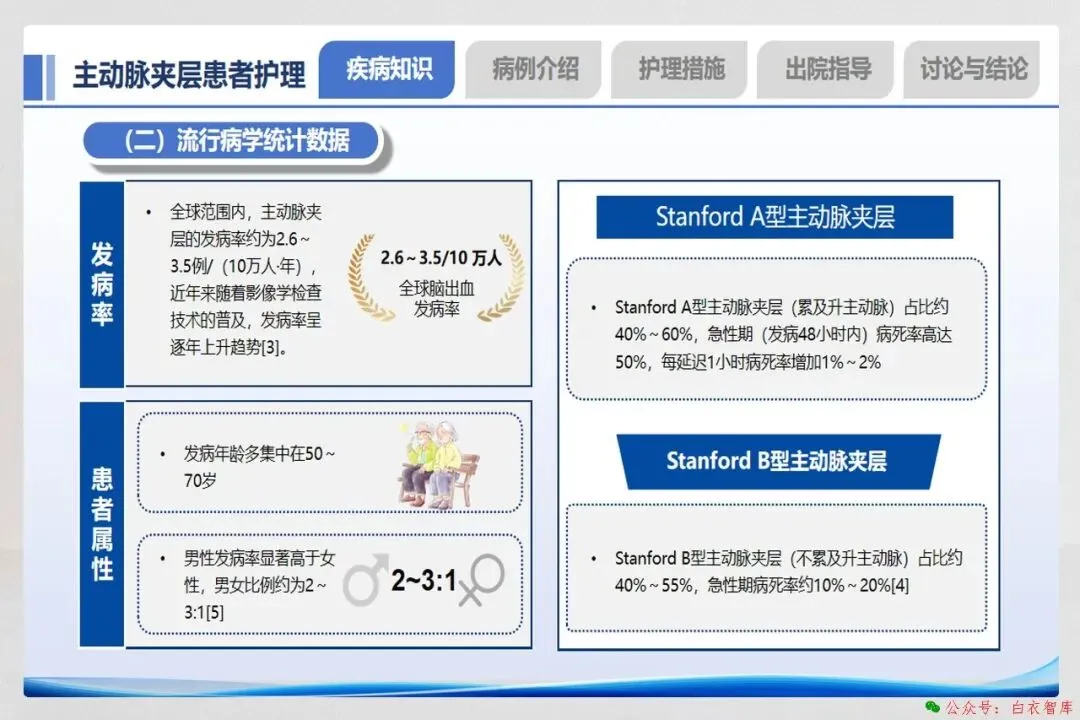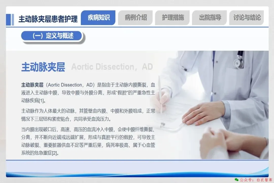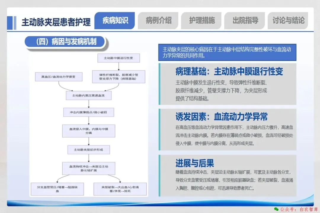 各位同仁,大家好!欢迎来到白衣智库!主动脉夹层作为心血管急危重症,具有起病急、进展快、病死率高的特点,精细化护理是改善患者预后、降低并发症的关键。