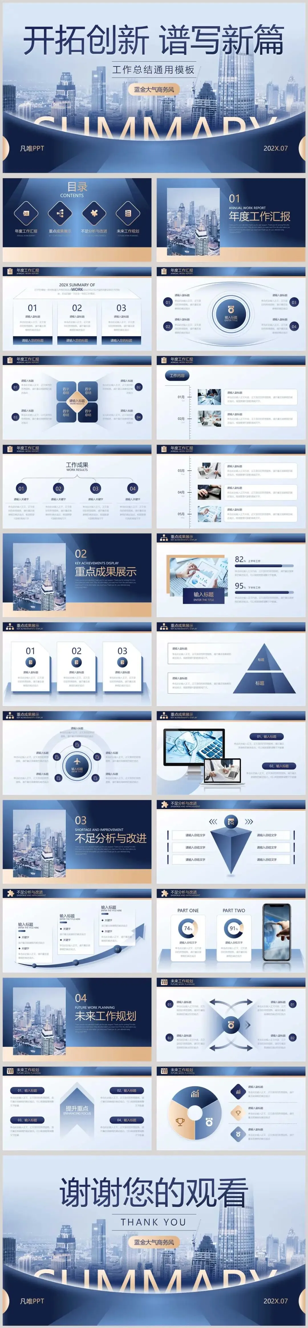 这是一套蓝金大气商务风“开拓创新谱写新篇”工作总结通用PPT模板,共24页;