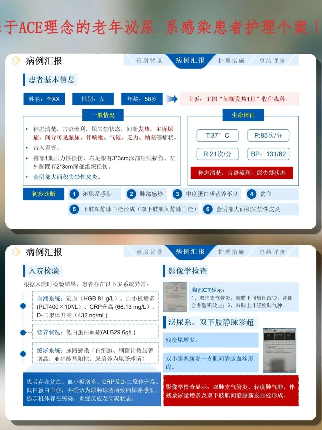 58岁女性,间断发热1月入院,诊断为泌尿系感染(尿肠球菌)、肺部感染、中度蛋白质营养不良、贫血、双下肢深静脉血栓形成、会阴部大面积失禁性皮炎,同时带入胃管,臀部1期压力性损伤,右足跟及左外踝深部组织损伤。入院检验显示HGB 81g/L、ALB 29.6g/L、CRP 66.13mg/L、D-二聚体432ng/mL,尿白细胞满视野、细菌3+。