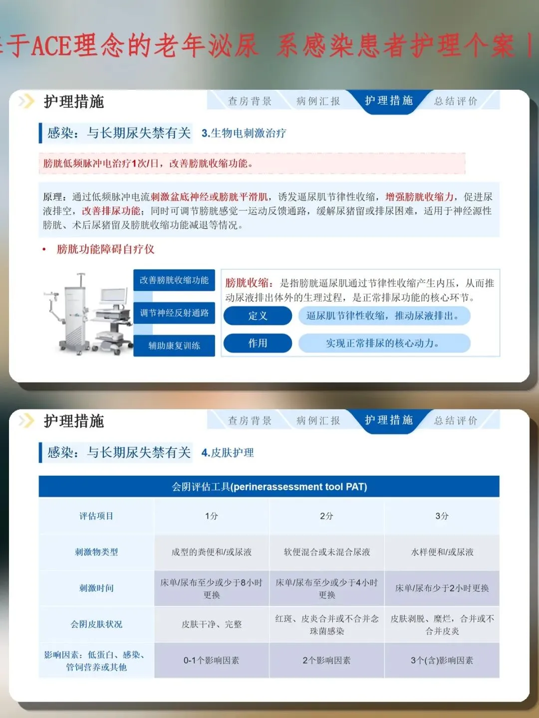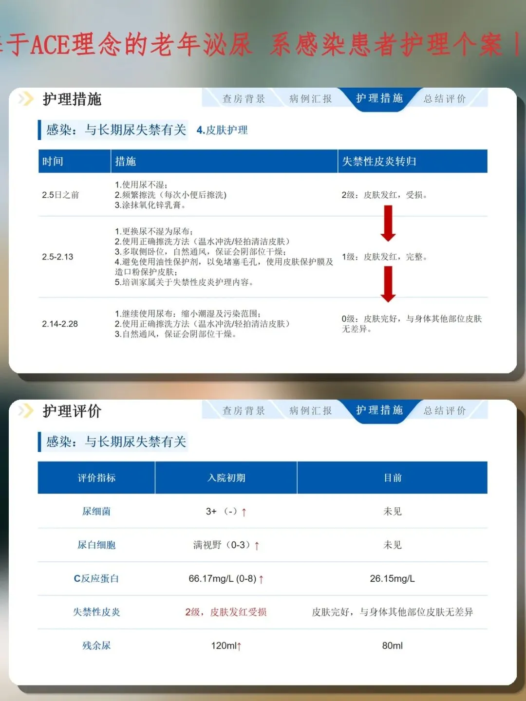 经过28天ACE模式管理,患者尿细菌、白细胞转阴,CRP从66.17降至26.15mg/L,失禁性皮炎痊愈,残余尿从120ml降至80ml,无新发并发症,家属掌握间歇导尿及皮肤护理技能后出院。