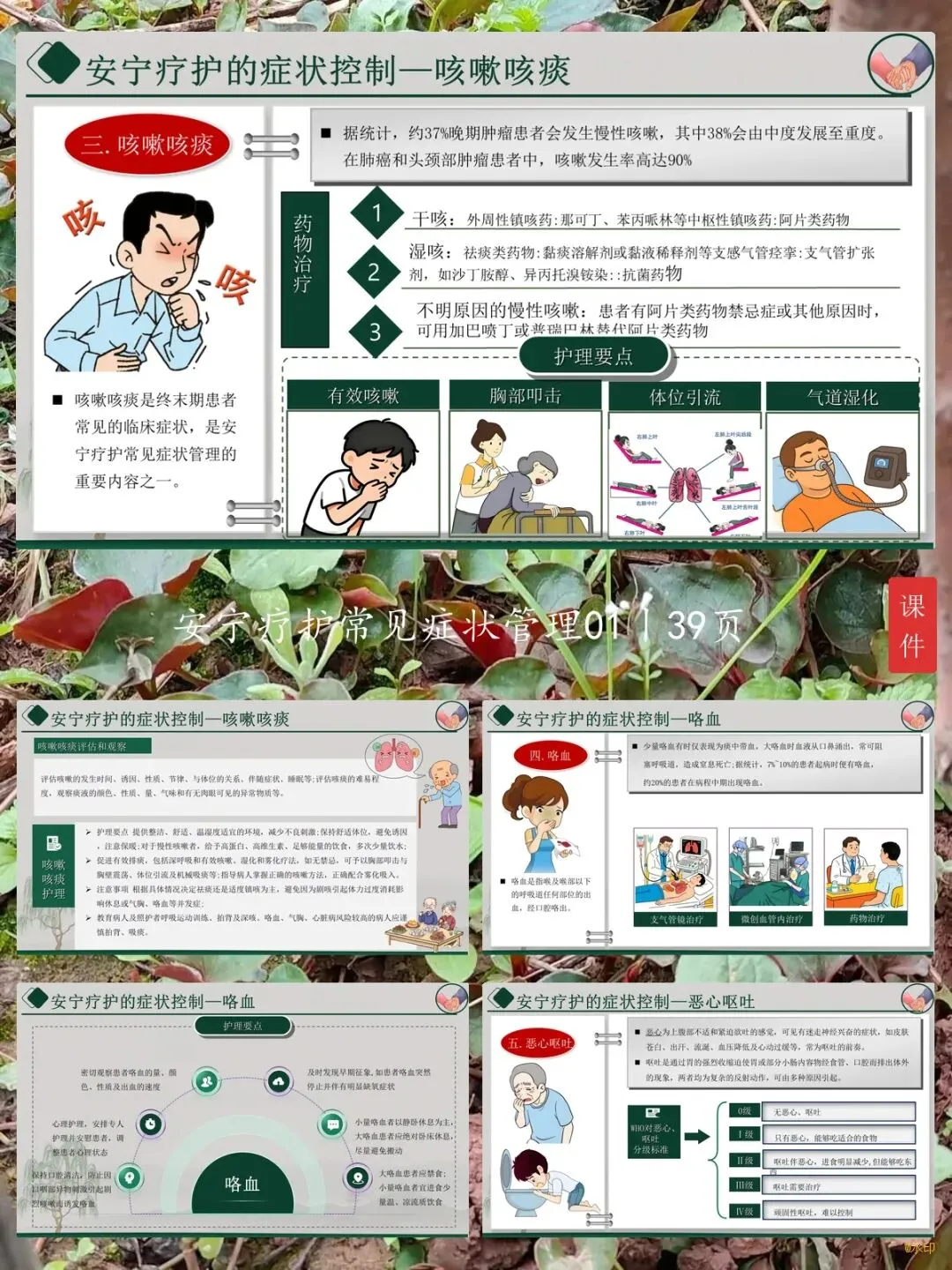 然后说重点,常见症状管理。常见的症状有疼痛、呼吸困难、咳嗽咳痰、咯血、恶心呕吐、腹胀、水肿、发热,还有厌食恶病质、口干、睡眠障碍、谵妄这些。