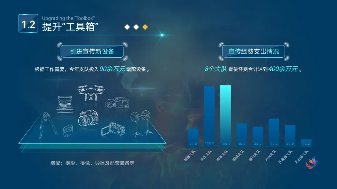 根据工作需要,今年支队投入90余万元增配摄影、摄像、导播及配套装备等专业设备,8个大队宣传经费合计达到400余万元。