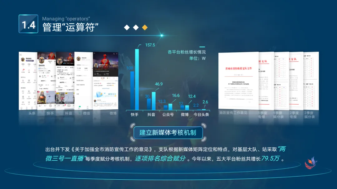 出台并下发《关于加强全市消防宣传工作的意见》,支队根据新媒体矩阵定位和特点,对基层大队、站采取“两微三号一直播”每季度赋分考核机制,逐项排名综合赋分。今年以来,快手粉丝量从100万增长到157.5万;抖音粉丝量从30万增长到46.9万,微信公众号用户量从12.3万增长到16.6万;微博粉丝量从12万增长到12.4万;今日头条粉丝量从2.2万增长到2.6万;五个平台粉丝增长量约79.5万。