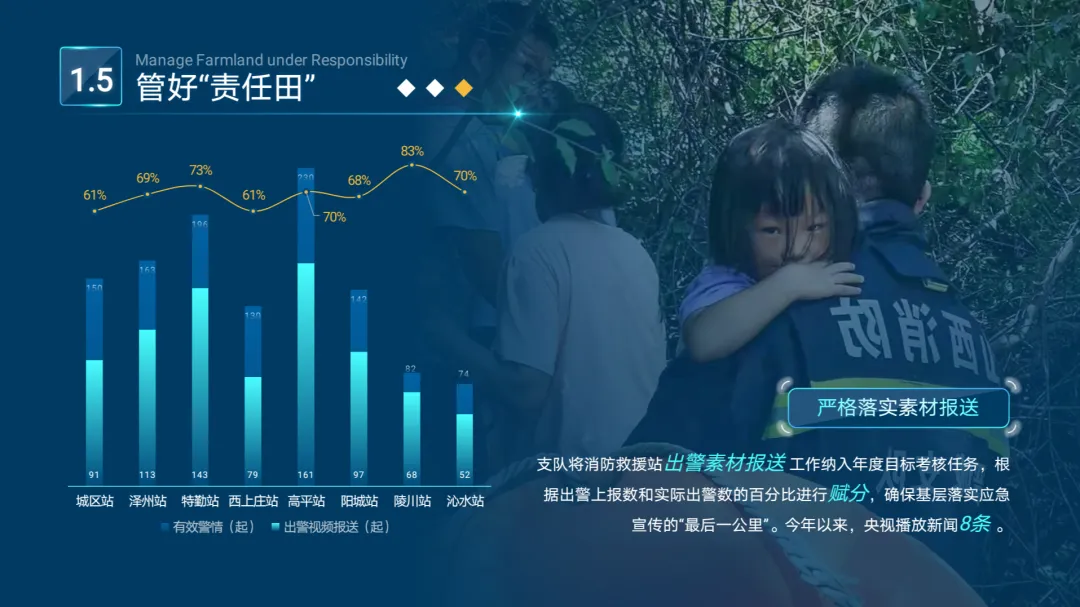 支队将消防救援站出警素材报送工作纳入年度目标考核任务,根据出警上报数和实际出警数的百分比进行赋分,今年以来各消防救援站上报比例均在60%以上,截至目前在央视播发新闻共计8条。