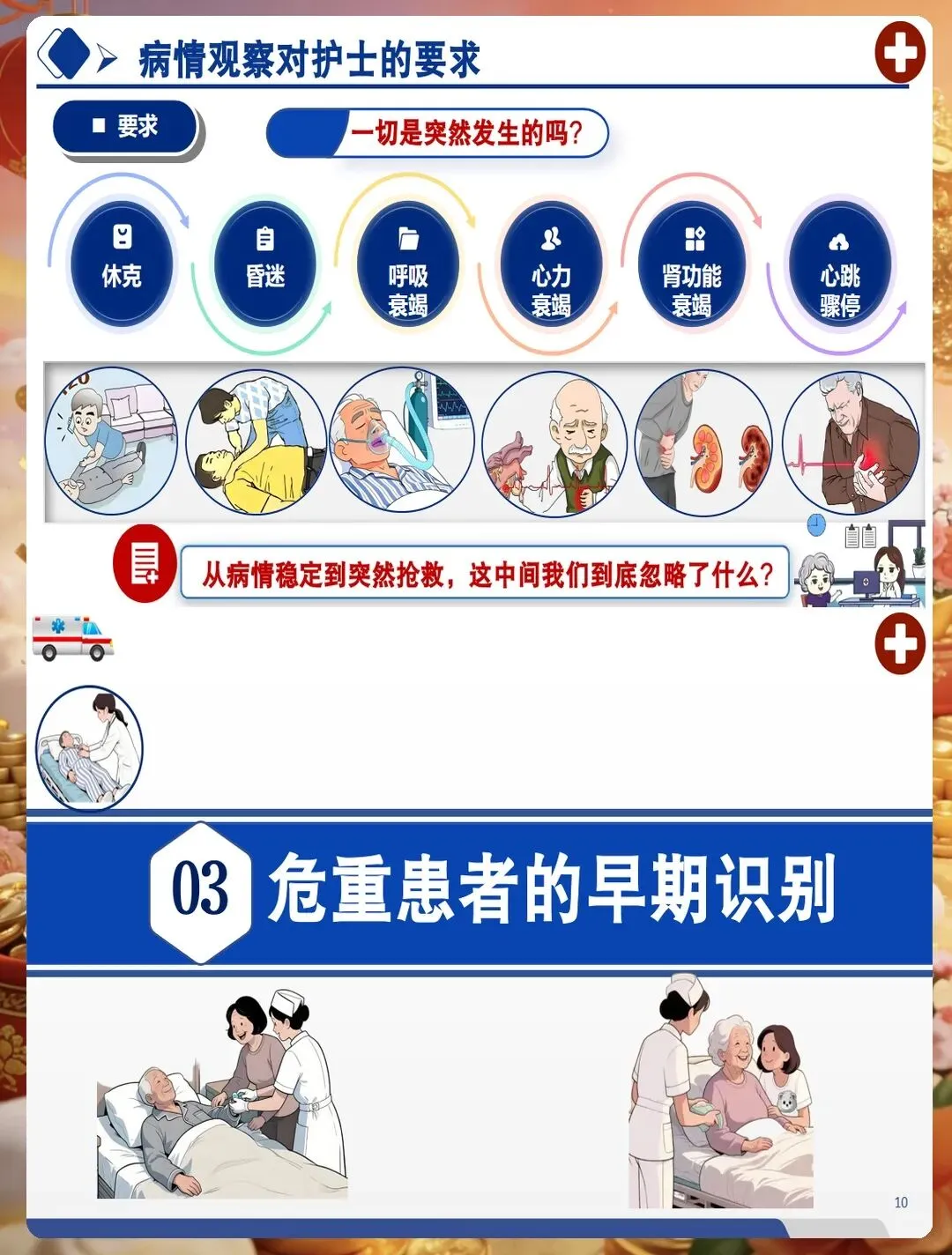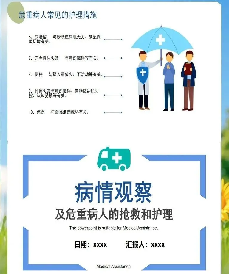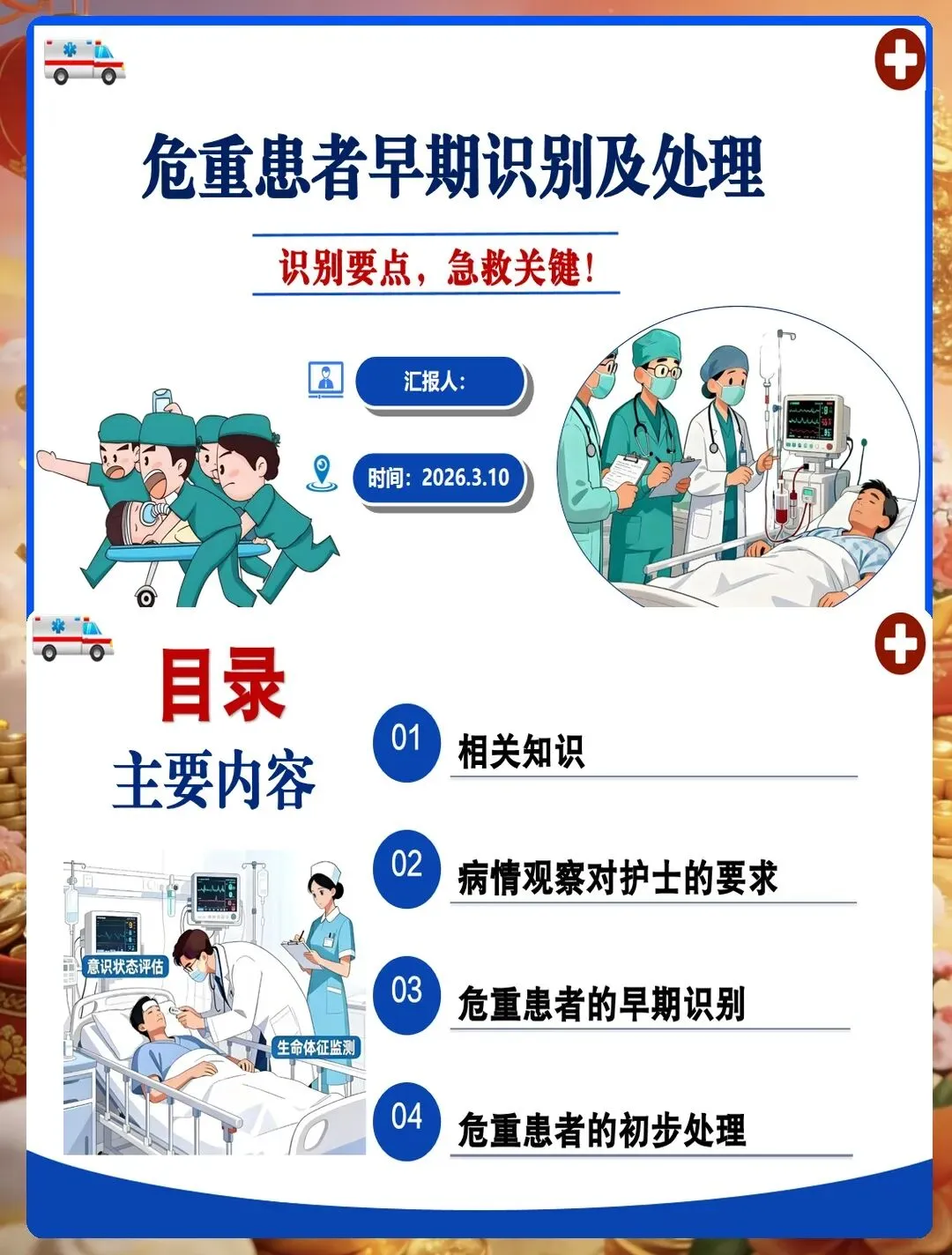 瞳孔的变化更是神经系统观察的重中之重,大小、对光反应、双侧是否等大,这些都可能在短时间内发生变化。生命体征的观察不能只看数据,要看趋势,心率从80升到90再到100,虽然每一步都在正常范围内,但这个上升趋势本身就在提示问题。呼吸的观察要看频率、节律、深度、有没有辅助呼吸肌参与,这些细节比呼吸频率的数字更有意义。皮肤的颜色、温度、湿度、弹性,肢端有没有紫绀,尿量多少、颜色怎么样,这些观察虽然基础,却能反映患者的循环状态和器官灌注情况。疼痛的评估也很重要,不能只问疼不疼,要评估疼痛的部位、性质、程度、加重缓解因素。观察之后要及时记录,记录要客观准确,用描述性的语言,不要用模糊的词语。二、危重患者抢救的组织与配合