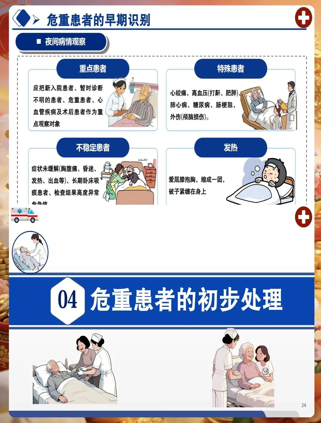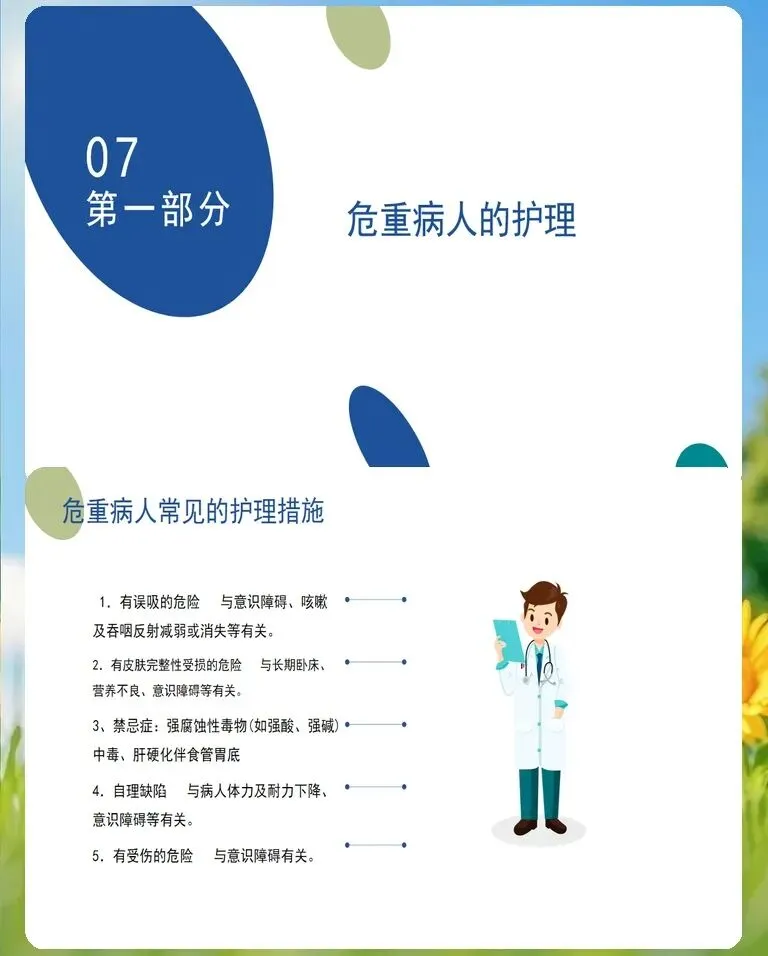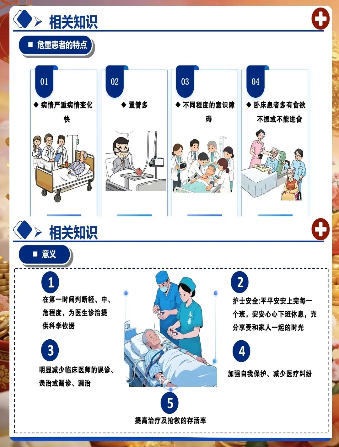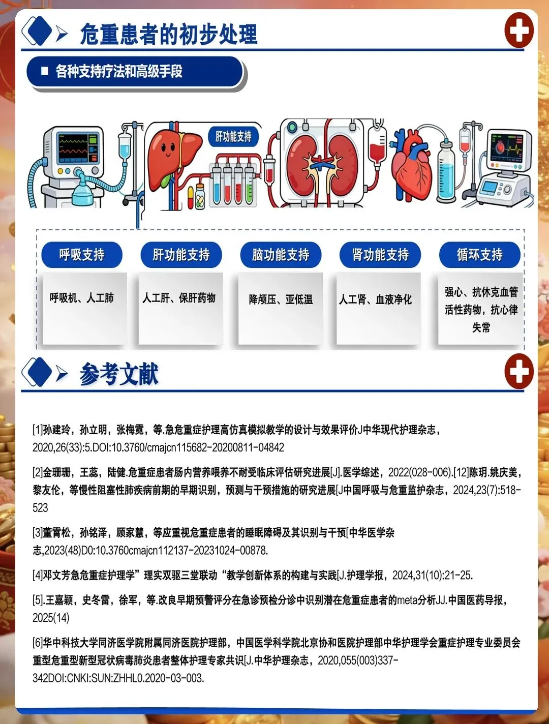 静脉通路要保证通畅,危重患者往往需要多条通路,外周静脉打不进去要果断选择中心静脉。抢救过程中每执行一项医嘱都要复诵确认,避免听错用错,特别是多种药物同时使用时更要仔细核对。气管插管、深静脉置管这些操作,护士要做好配合,体位摆放、物品递送、生命体征监测,每个环节都要跟上。抢救记录要同步进行,抢救结束后及时整理完善,时间节点、用药情况、操作过程、患者反应,都要准确记录。抢救结束后的物品整理和补充也很重要,用过的药品要及时补充,设备要检查归位,确保下次抢救能随时使用。三、危重患者的护理重点与安全管理